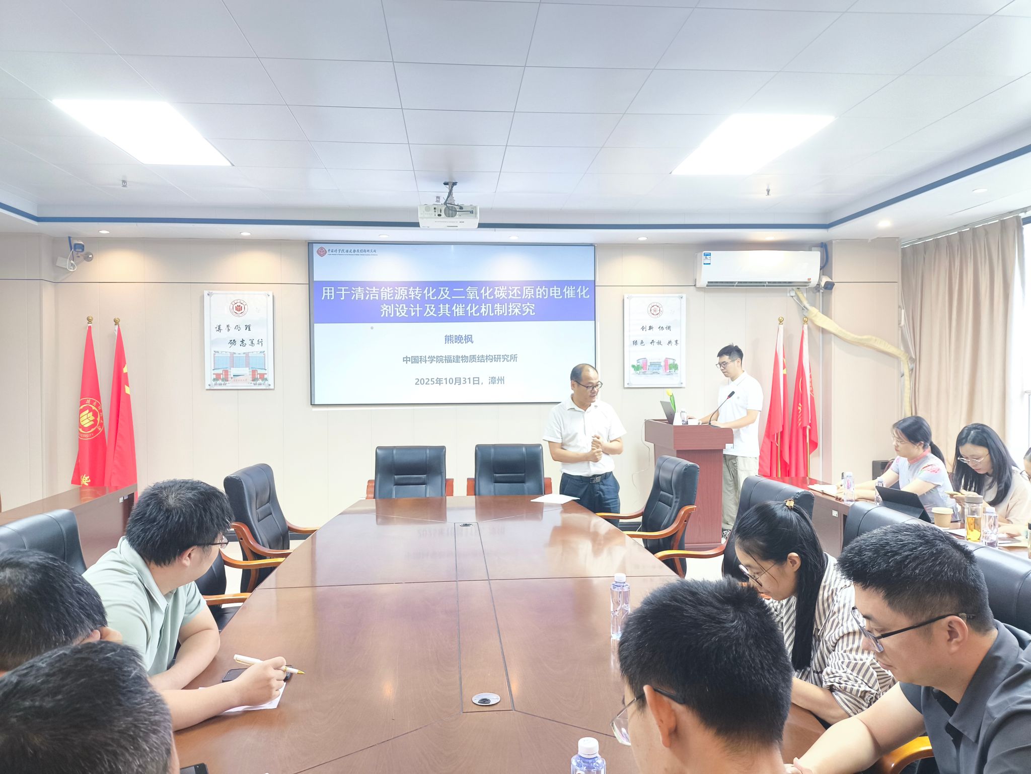 为拓展学术视野、促进科研交流,2025年10月31日,中国科学院福建物质结构研究所熊晚枫博士后应邀莅临我院,在科技楼北1103会议室作了题为“用于清洁能源转化与二氧化碳还原的电催化剂设计及其催化机制探究”的专题讲座。讲座由我院院长张茂升教授主持,学院教师踊跃参与,现场学术氛围浓厚。