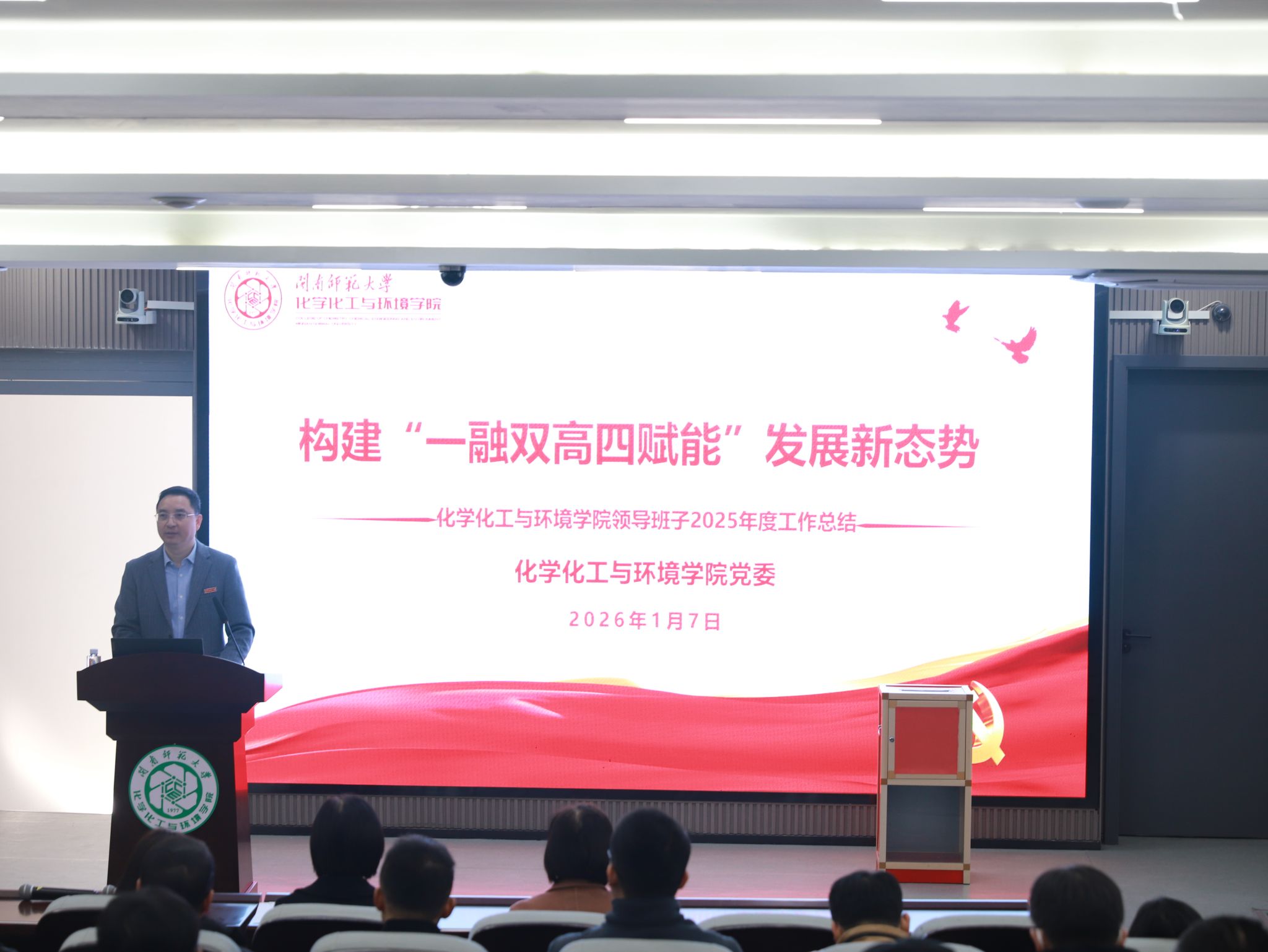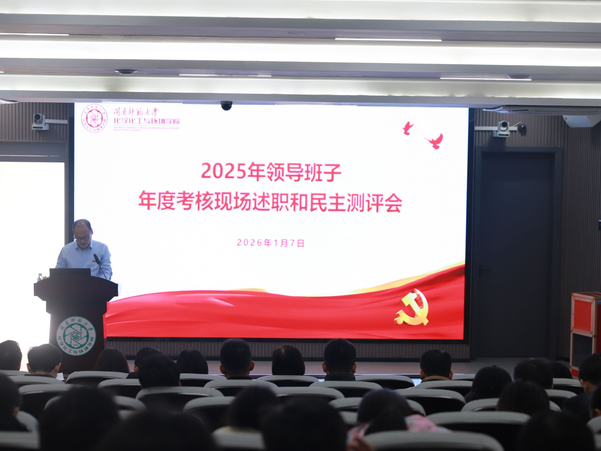 岁末复盘凝共识,蓄力扬帆启新程。为进一步推动中层干部履职尽责担当作为,促进学院各项事业高质量发展,1月7日上午,我院于达南206召开2025年度学院领导班子和中层干部述职考核大会。校党委常委、副校长张宏怡为组长的第七考核组一行莅临考核指导,学院全体党政班子成员、教职员工及学生代表参加考核会议。
