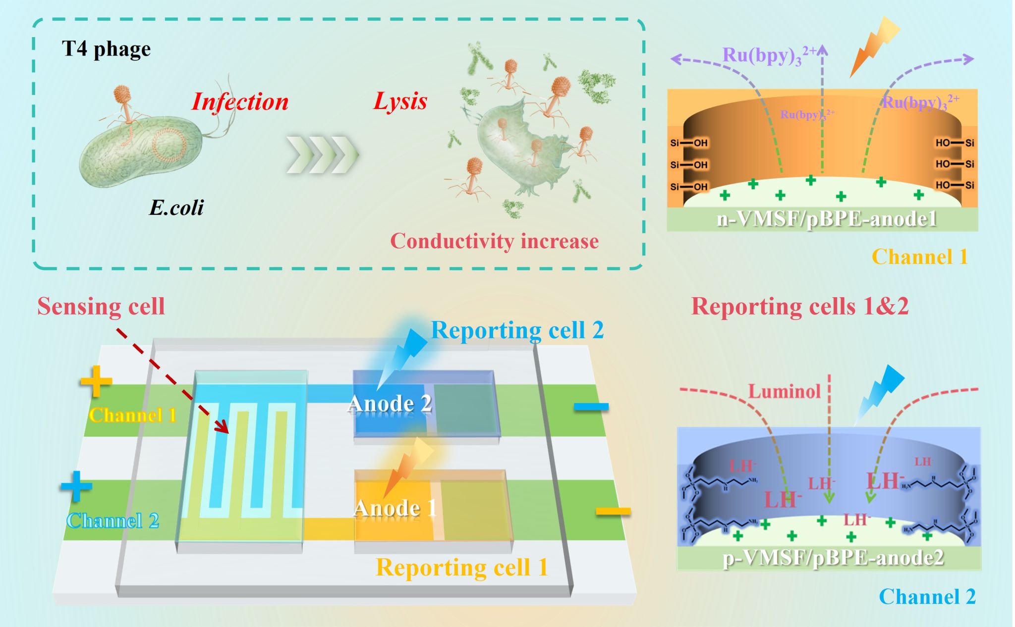 双极电化学发光(BPE-ECL)具有传感-信号分离的特点,适用于免探针固定、抗背景干扰的生物传感器开发。基于双极的传感阵列可实现多目标物、多信号读取的检测,但其传感单元仍是单目标物对应单信号输出的模式。本研究工作提出了一种并行式的BPE-ECL传感平台:传感池中的电极设计成叉指的形式,可实现驱动电极与BPE阴极的功能切换;在两个BPE阳极端分别修饰上正、负电性的硅基纳米孔道,实现ECL探针的静电斥和吸引。利用T4菌体去特异性侵染大肠杆菌并引发宿主细胞裂解,其溶液电导率的上升使得BPE阳极端的电荷密度增强,由此排斥通道1中的Ru(bpy)32+探针而吸引通道2中的Luminol探针,形成关于同个目标物的双通道比率型ECL信号输出。