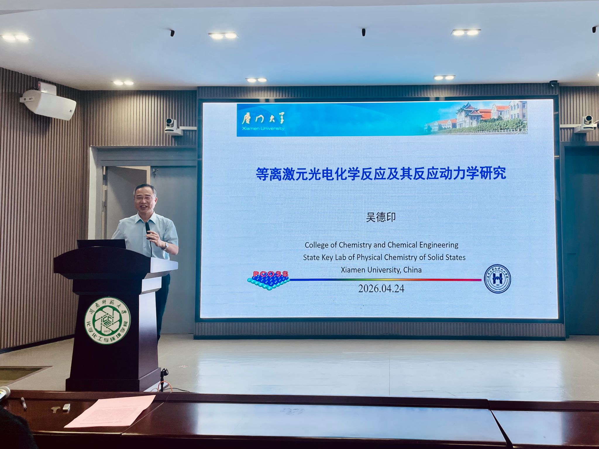 为拓宽学术视野,深化科研交流,探讨光电化学领域的前沿发展,2026年4月24日下午,厦门大学化学化工学院吴德印教授应邀莅临我院,于江滨校区达理楼南206多功能厅作了题为“等离激元光电化学反应及其反应动力学研究”的学术报告,报告由凌云副教授主持。